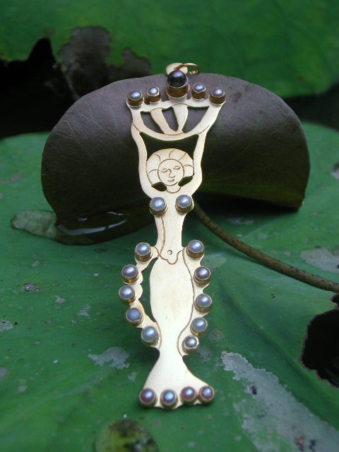 Mermaid Pendant design by Jelila, hand-cut from Sterling Silver, set with cultured pearls, gold plated - Matches the Soulmate Love Necklace and can also easily be worn on any of Jelila's Crystal Healing Necklaces - comes with a clever earring style clasp so is easy to clip on any necklace! Height 5cm approx, engraved with designer's name on the reverse. Design is a Mermaid holding up a shell, meaning is 'bringing wisdom from the deep', it's function is to encourage intuition.