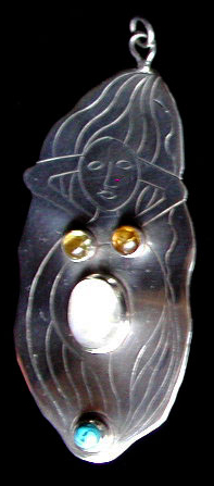 Reclining Goddess Pendant design by Jelila, for gently Flowing through Life, hand-cut from Sterline Silver, set with Rainbow Moonstone for Intuition, Citrine for Clarity of Action, Turquoise for Relaxation - helps you flow through life with ease. Matches the Soul Purpose Necklace, can also easily be worn on any other of Jelila's Crystal Healing Necklaces as you like - comes with a clever earring style clasp that is secure. Height 6 cm approx, engraved with designer's name on the reverse. For Flow.