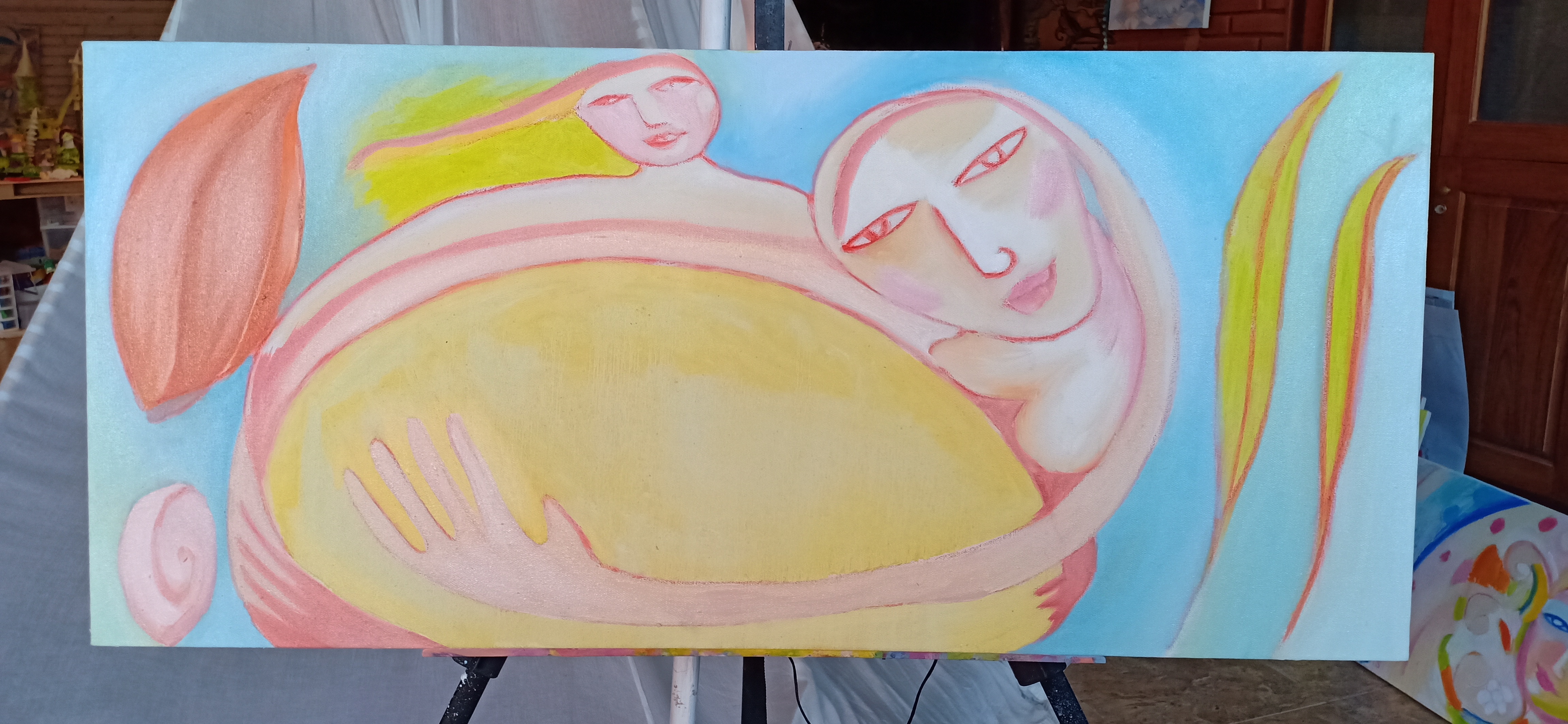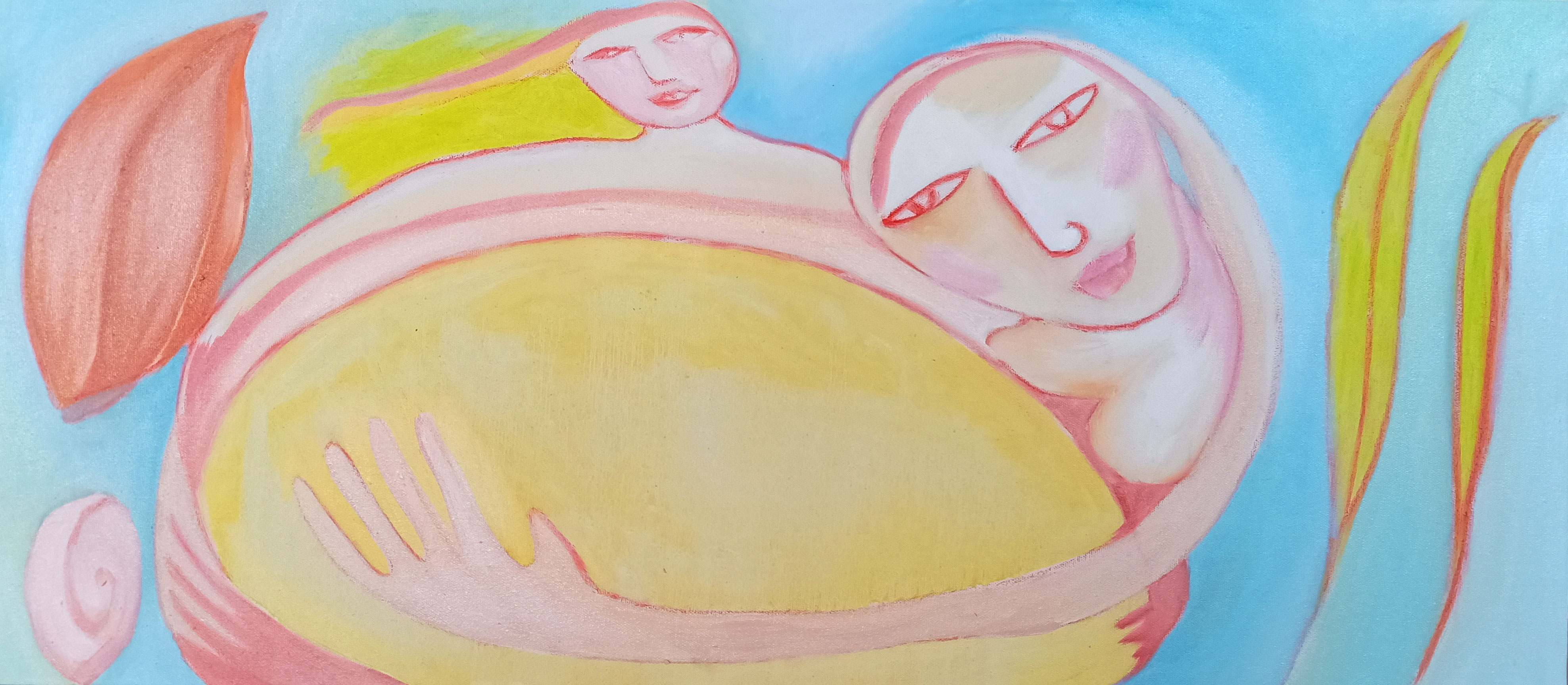 Loving My World (ref: 1116), oil painting by Jelila, 36" c 16" approx, oil on canvas, is from a series painted for Zero2Expo - a prestigious exhibition and ongong art programme that Jelila's art appears in, in the UK, created to enhance awareness around safe and happy birth for mothers and babies.