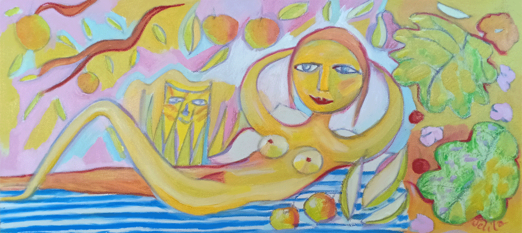 Jelila continues: 'I've explored themes around the perceived 'loss of paradise', and also simply the enjoyment of a beautiful fertile land - ie Eden - and of the couple's free-seeming relationship in that place - in these paintings. These themes are also deep themes of my planetary healing work.'