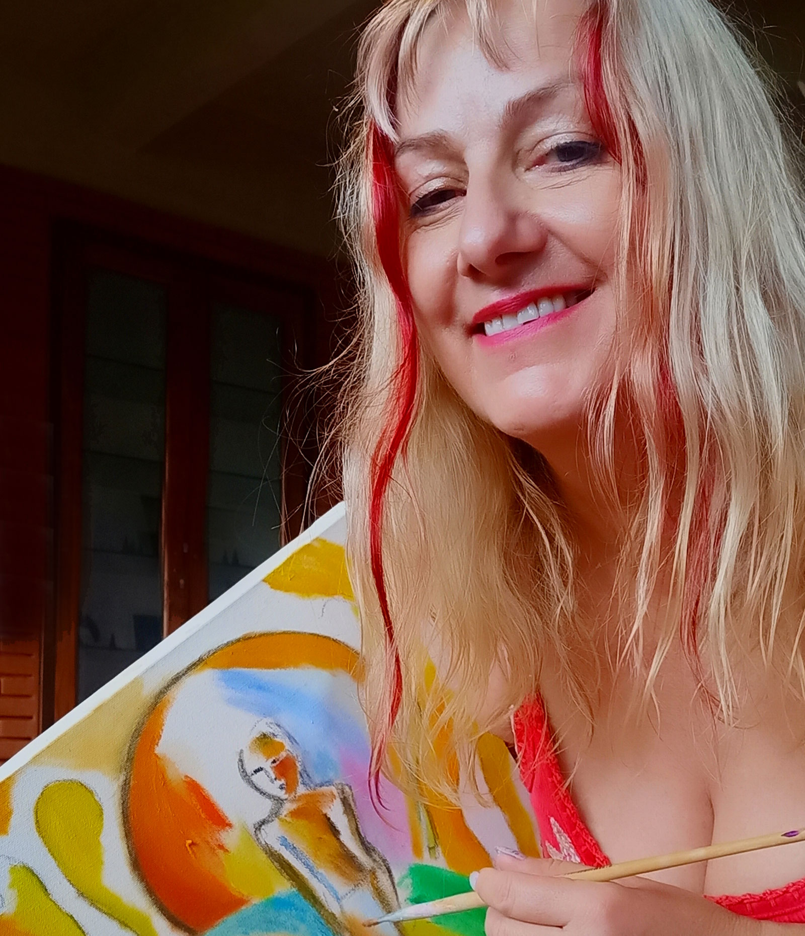 Standing Stones of Love (ref: 1115), oil painting by Jelila, 36" c 16" approx, oil on canvas, from her series of 8 paintings of the same size and shape, created for Zero2Expo, a prestigious exhibition that she is represented in, in the UK which aims to raise awareness and campaign for happy safe birth and life for mothers and babies.