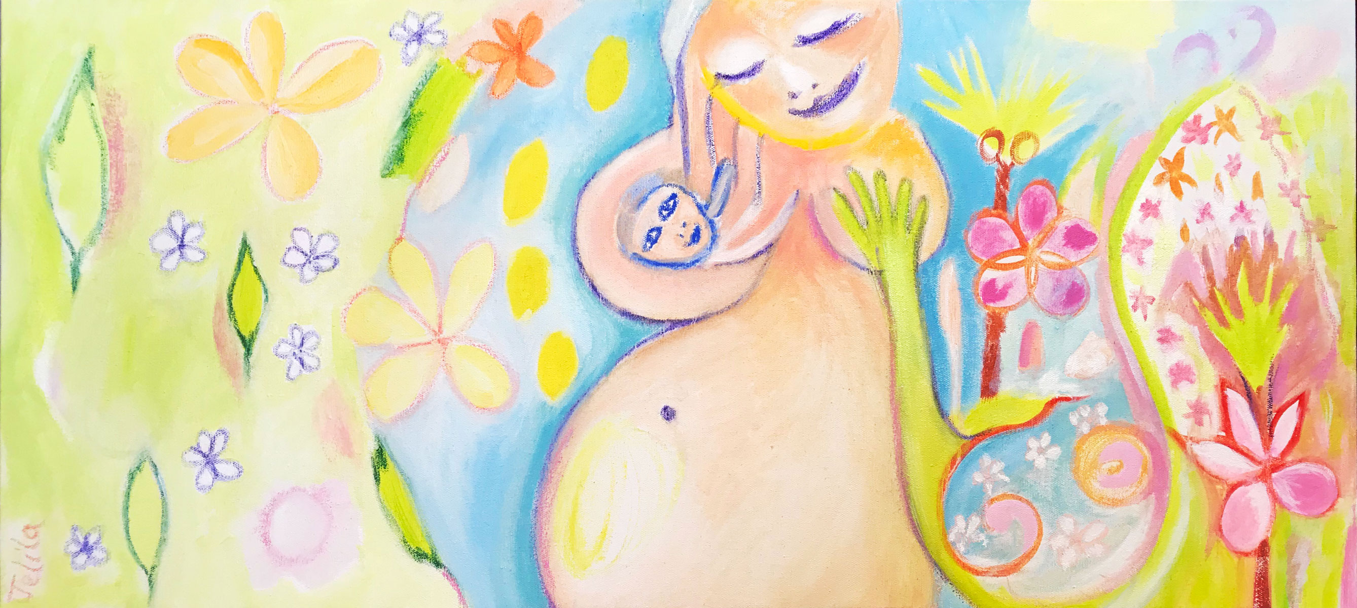 Welcome to my World, oil painting by Jelila, (ref: 1110), 36" c 16" approx, oil on canvas, from her series of 8 paintings of the same size and shape, created for Zero2Expo, a prestigious exhibition that she is represented in, in the UK which aims to raise awareness and campaign for happy safe birth and life for mothers and babies.