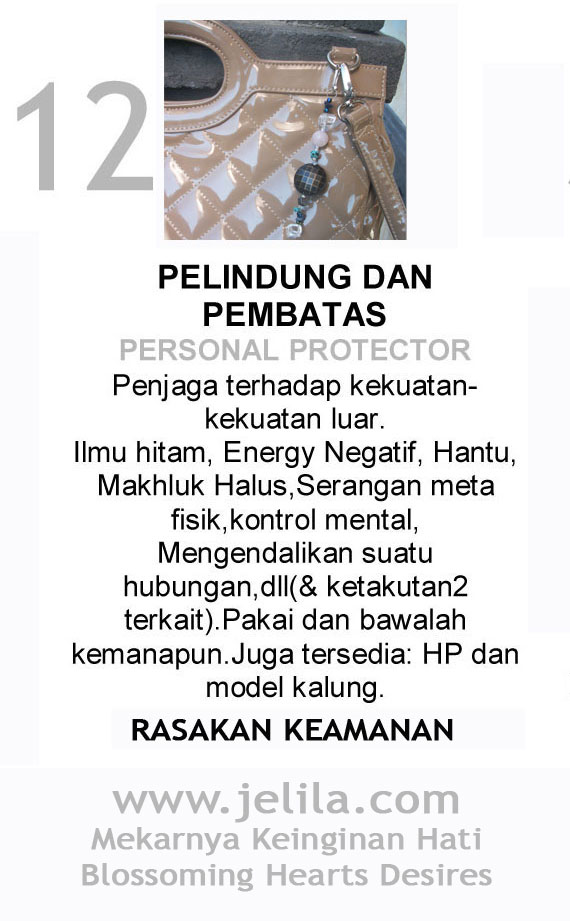 Ilmu hitam, Energy Negatif, Hantu, Makhluk Halus,Serangan meta fisik,kontrol mental, Mengendalikan suatu hubungan,dll(& ketakutan2 terkait).Pakai dan bawalah kemanapun.Juga tersedia: Crystal Remedy.